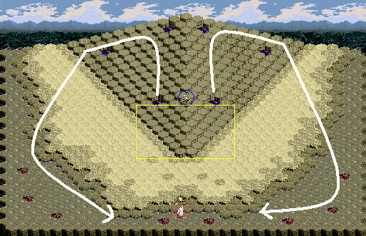ギュネ・フォスが水場付近まで来たら、ダウンタイドで水位を下げて一気に赤の魔晶石を回収してしまいましょう。このころになると、すでに夜になっているのでギュネ・フォスはゼノスブリードの魔法で一撃で落とされてしまいますが、左右両方のギュネ・フォスが落とされることはまずないので、片方をおとりにしてでも、もう片方を進ませましょう。相手は砂地があるのでもううしろには戻っていけません。あわてて戻っても時すでに遅く、回復量には圧倒的な差がついているはずです。上級ネイティアルでひと思いにたたいてあげましょう。