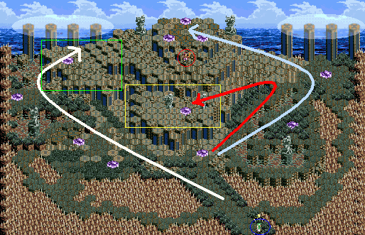 この面では、相手に弓系ネイティアルを呼ばせないことが最優先課題です。頂上で呼んだ弓系のネイティアルの攻撃はこのマップの6割をカバーするほどの射程になります。では、具体的にどうすればいいか?それは、初めに火のネイティアルを大量生産することです。したがって、開幕には前方に進みながら「グリオン」→「ダルンダラ」→「ヘピタス」あたりがいいでしょう。もちろんMPがあるようならオーンヴィーヴルやブリックスも呼びます。このマップでは、相手は初めにアモルタミスを召喚して進行してくるので、自分の周りを火のネイティアルで固めておく必要があるのです。召喚した火のネイティアルは、一体は右上の魔晶石を取りに。他はアモルタミス対策のために近くに残します。グリオンは白線のルートで魔晶石を取っていきましょう。