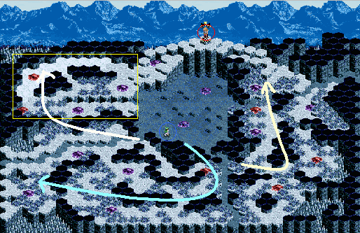 そして次にグリオンをどちらの方向にとばせるかですが、迷わず黄色いエリアに向かいましょう。ゼノスやネプトの射線からよけて、黄色いエリアの赤い魔晶石を青く塗り替えていきましょう。このとき、くれぐれも死なないようにしましょう。グリオンは後で重要な役目が待っています。続いて呼んだギュネ・フォスは、それぞれ青と黄色の線に沿って魔晶石を回収していきます。クレールはグリオンに続いて左上の方向に歩いていき、魔力の状況と敵ネイティアルの動向を見ながらゼノスやダ・カーム、アモルタミスなどを召喚し、自分の身の安全を確保します。魔力が五分になった頃、ようやくバ・メードの登場です。ギド・カーンはペリットを召喚しますが、このペリットを先ほどから潜ませていたグリオンで始末し、一気に固めてしまいましょう。もちろん、ペリットごとコンジュレートで固めてしまっても構いません。固めてしまえばあとは残存勢力の掃討です。ギド・カーンが解凍しないように時々固めなおしてあげながら一体ずつ確実に減らしていきましょう。とりあえず現状では固める以外の勝ち方が見つかっていません。(^^;;