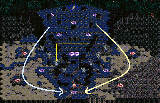 また、途中余裕があったらペリットやギュネ・フォスを召喚し、矢印のようにとばして魔晶石を回収してしまいましょう。相手にゼノスブリードがいるとつらいので、ゼノスブリードの注意が左右どちらかに移った隙に反対側から向かいましょう。(^-^