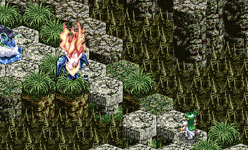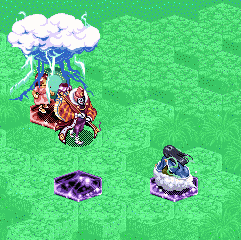 開幕はクレールがギュネ・フォス、レア&フィーナがグリオンを召喚し、ともに右上の魔晶石を目指す。さすがにギュネ・フォスとグリオンを戦わせる気はないので、方針変更してレア&フィーナに速攻をかけることに。クレールはレグナ・クロックスを召喚。レア&フィーナはそれに対抗してオーンヴィーヴルを召喚。魔晶石上だし昼間ならオーンヴィーヴルの一撃を食らっても死なないので、気にせずレア&フィーナに魔法を使う。さすがに真正面なので威力はなく2のダメージ。ここで各キャラの行動順を見てみると、