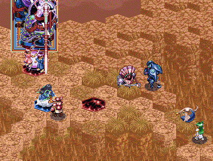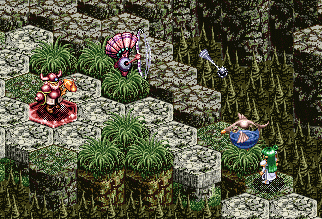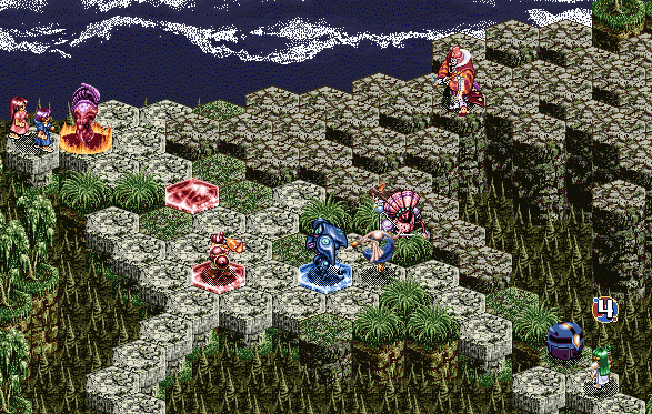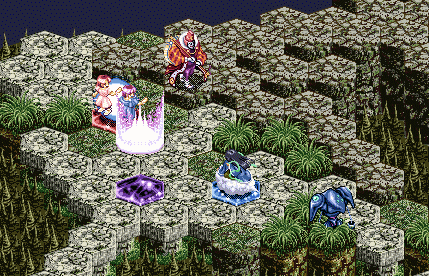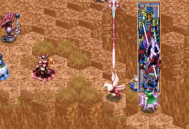 の順。ここで問題なのが、レグナクロックスのターンが回ってきたときに、レア&フィーナの体力は残り9。レグナクロックスの魔法を魔晶石上で斜め後ろから食らうと6。そこにギュネ・フォスの背後魔法をくらうと3でちょうどしんでしまうんですね。しかも密かにレグナ・クロックスの移動範囲の中に斜め後ろと判定される場所が一カ所あるようだ。ここから後ろに下がるとレア&フィーナの負けは目に見えてるので、その斜め後ろのポイントにオーンヴィーヴルを移動。さらに、レア&フィーナのターンでヘピタスを召喚し、レグナ・クロックスがつっこんできたらすぐに殺せるように陣形をとる。