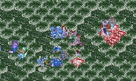 先ほども書いたとうり、このマップでガウと戦うのは初めてだったんで、どういう戦法を使うのかな?と、思っていたのですが、とにかくまっすぐこちらに向かってきました。一番いやな展開だ・・・。魔晶石が全て赤と青に染まった頃、双方の魔晶石数は、blue:7,red:6。魔力差のおかげで回復量は少しクレール有利です。このころにはすでにガウがクレールの目の前まで来ており、慣れない接近戦をすることになりました。